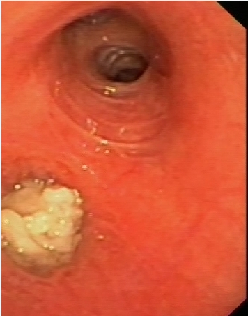Exophytic lesion with irregular polylobulated surface obstructing the left lower lobe bronchus