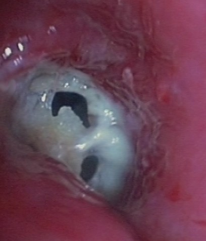 Stenosis due to a diaphragm-like deposition of fibrin (right anastomosis post lung transplantation).