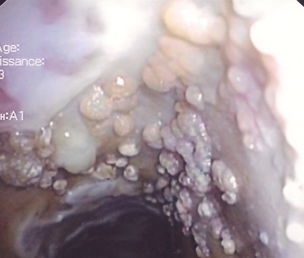 Mucosal ulcers in an immunocompromised patient. BAL and bronchial aspirations revealed a co-infection by Herpes simplex virus type 1, influenza A H1N1 and aspergillus.